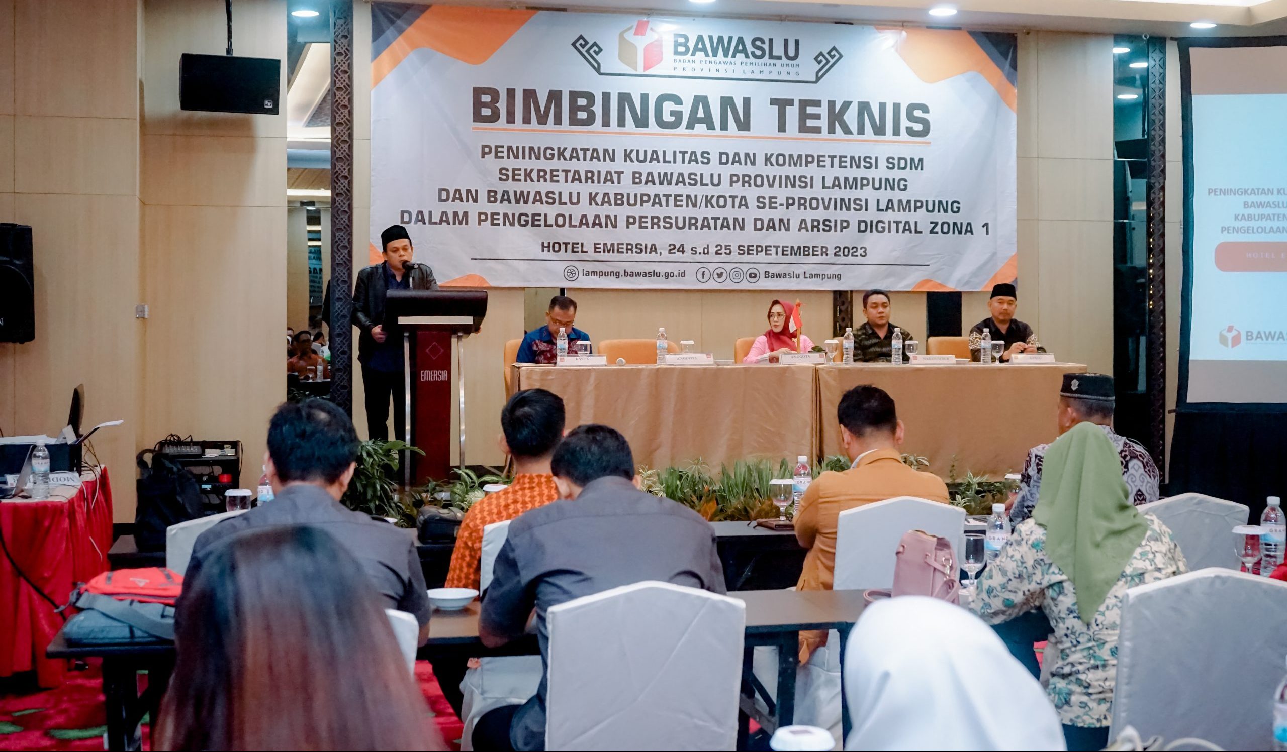 Bandar Lampung, Badan Pengawas Pemilihan Umum (Bawaslu) - Arsip adalah jantungnya organisasi dan arsip adalah sumber data sebagai bahan pertimbangan dalam memutuskan kebijakan, ungkap Koordinator SDM dan Organisasi Bawaslu Provinsi Lampung Imam Bukhori. Saat memberikan arahan dan sambutan pada Bimbingan Teknis Peningkatan Kualitas dan Kompetensi SDM Sekretariat Bawaslu Provinsi Lampung dan Bawaslu Kabupaten/ Kota Se Provinsi Lampung dalam pengelolaan persuratan dan arsip digital zona 1, Bandar Lampung (24/09/2023).