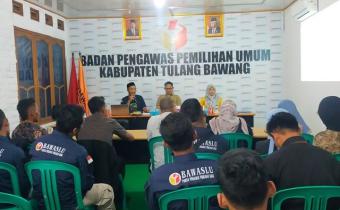Tulang Bawang-Pelantikan dan Bimibingan Teknis Panwaslu Kelurahan/Desa se-Kecamatan Banjar Agung, Banjar Baru dan Banjar Margo, yang diselenggaran di Gedung Serba Guna SMK Mitra Bangsa Unit II Banjar Agung Kabupaten Tulang Bawang, Senin (06/02/2023).