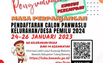 Diinformasikan kepada Calon Anggota Panwaslu Kecamatan se-Kabupaten Tulang Bawang, berdasarkan Keputusan Ketua Badan Pengawas Pemilihan Umum (Bawaslu) Republik Indonesia Nomor: 354/HK.01/K1/10/2022 Tentang Perubahan Keputusan Ketua Badan Pengawas Pemilihan Umum (Bawaslu) Republik Indonesia Nomor: