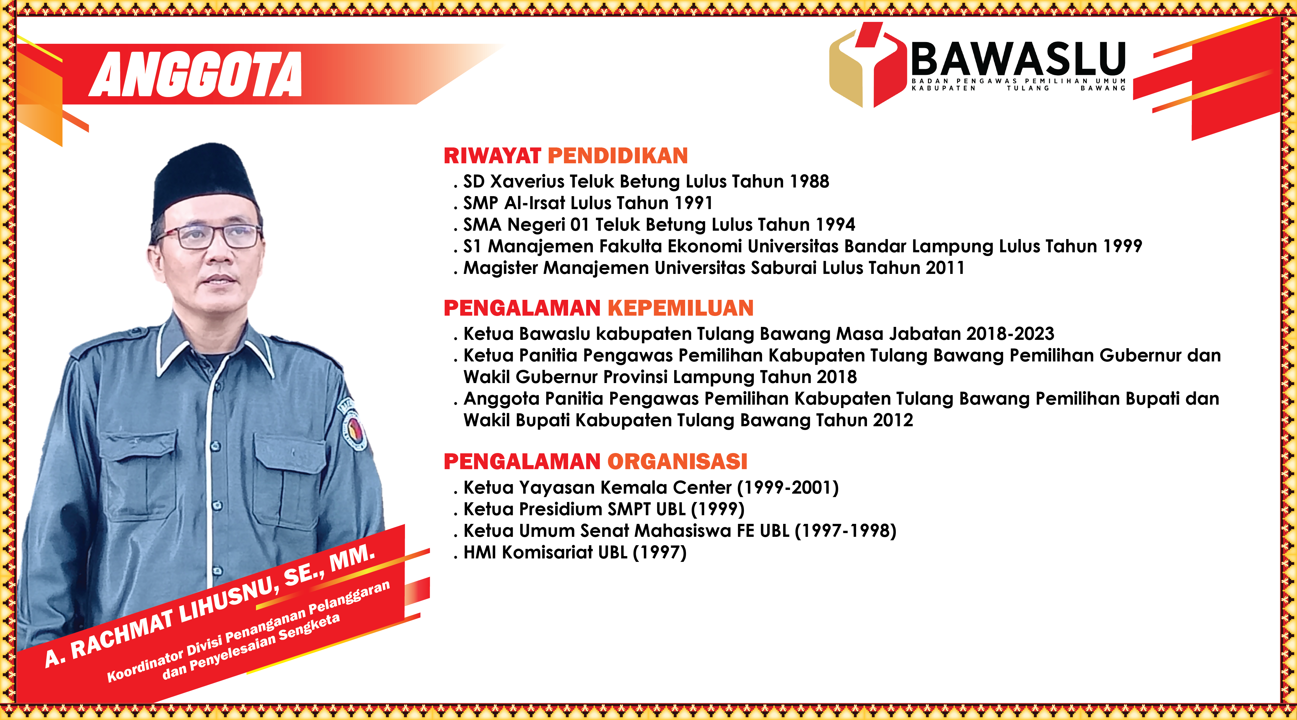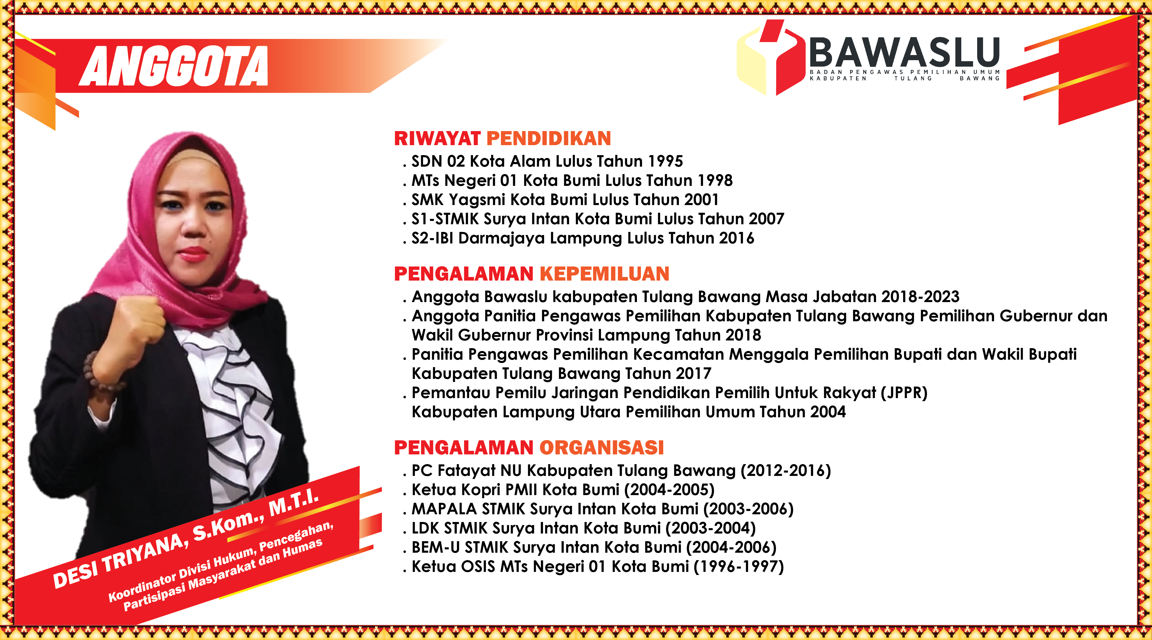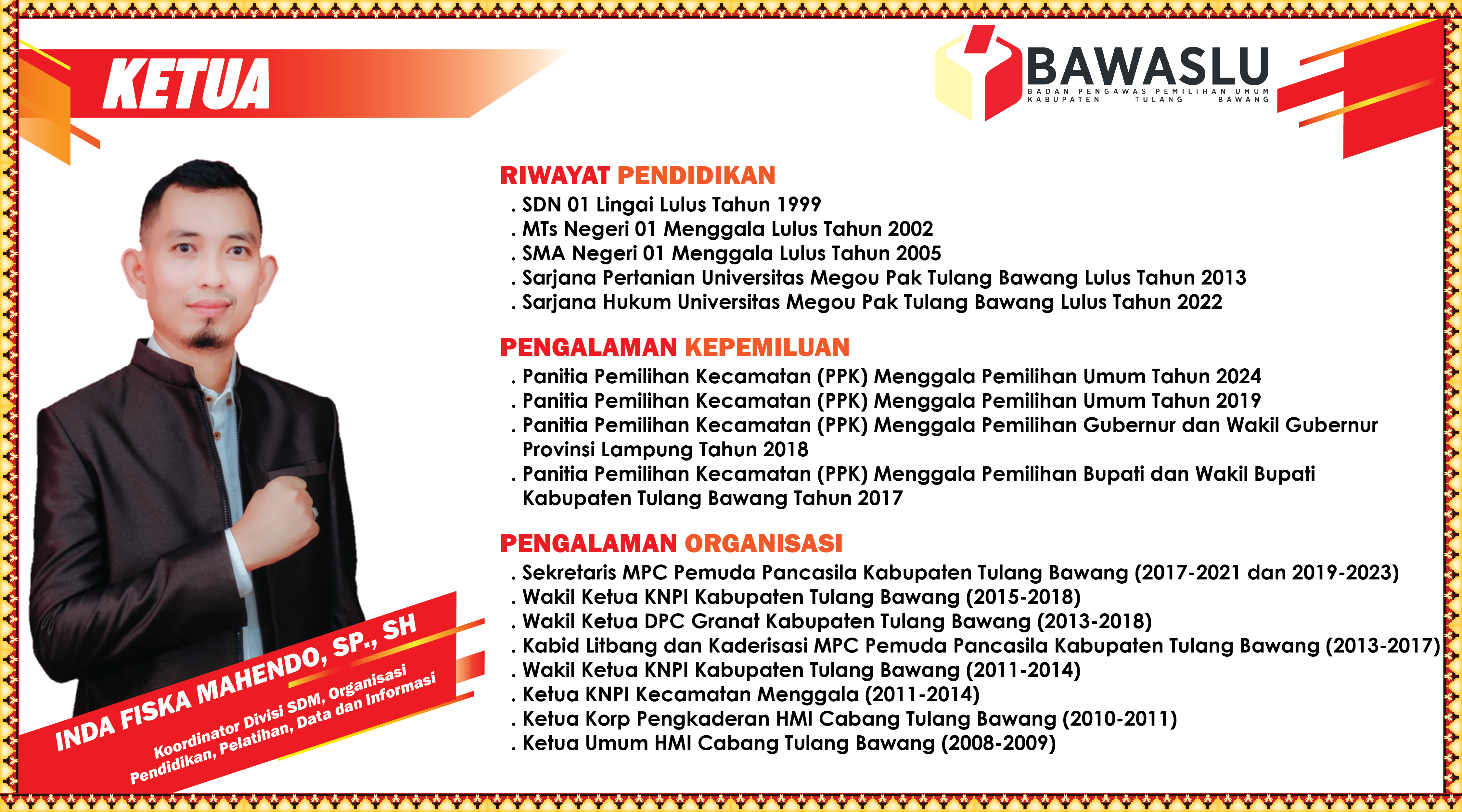 humas | Senin, Agustus 28, 2023 - 09:41 INDA FISKA MAHENDRO, SP., SH. DESI TRIYANA, S.Kom., M.T.I. A. RACHMAT LIHUSNU, SE., MM. Share